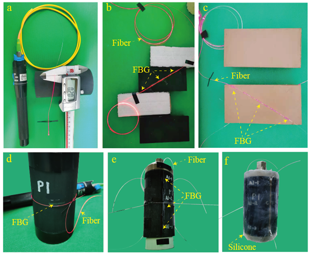 图1 样品制备及FBG传感器布设。a-e将直径0.2 mm的FBG传感器分别布设于内部断层面、内部断层泥、外部环向和外部轴向。f外部涂上硅胶,分隔孔压和围压体系