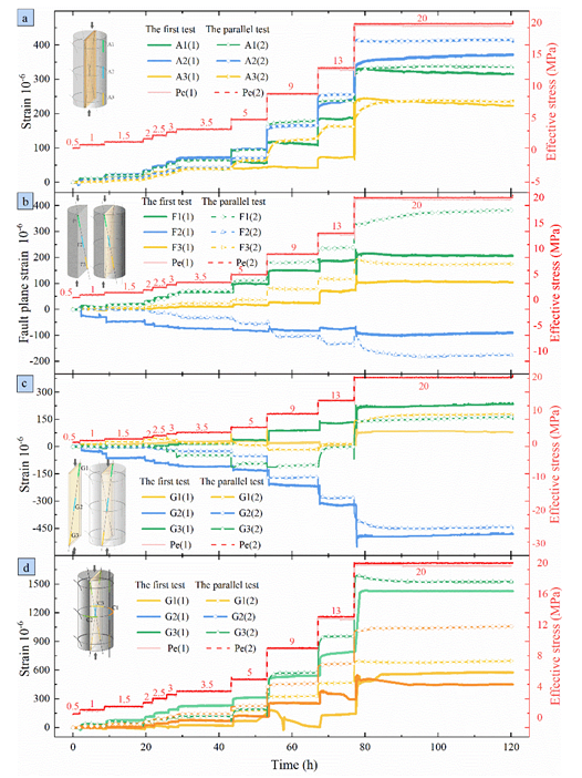 图2 应力扰动下断层应变的时程演化曲线。a-d分别是断层外部轴向、内部断层面、内部断层泥和外部环向的应变时程演化曲线