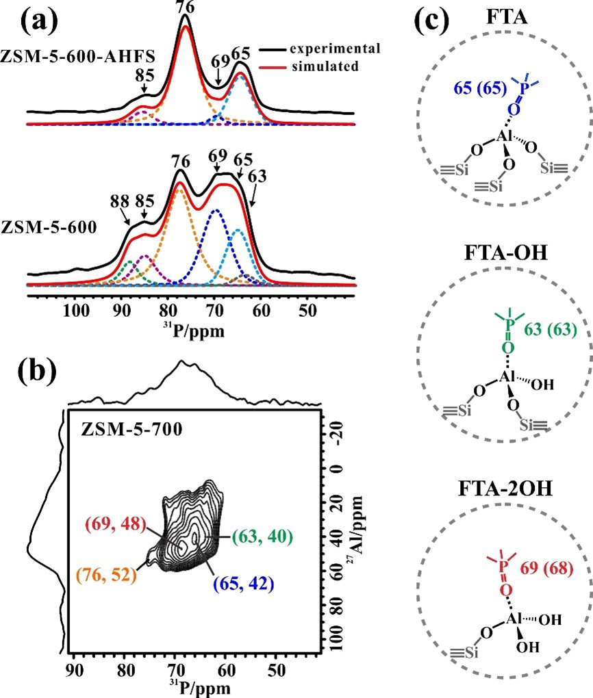 ZSM-5沸石分子筛是一种重要的微孔固体酸催化剂,可用于MTH反应过程以替代石油路线生产汽油、低碳烯烃以及芳烃等高附加值燃料与化学品。在ZSM-5分子筛中,Bronsted(B) 酸位和Lewis(L)酸位是重要的催化活性位点。其中B酸来源于骨架四配位铝形成的Si-OH-Al 桥式羟基结构;L 酸则来源于骨架四配位铝部分分解形成的骨架、骨架嵌连铝物种以及全部分解形成的非骨架铝物种。与结构较为明确的B酸位相比,人们对于沸石分子筛中L酸位的具体结构以及其反应活性仍然不清楚。研究并理解ZSM-5分子筛上L酸位的结构以及活性,对于构建ZSM-5分子筛的构效关系,从而实现对该催化剂的高效利用具有十分重要的意义。