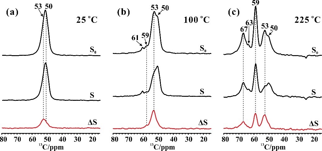 ZSM-5上13C-甲醇在不同温度下反应后分子筛上残留物种的 13C-27Al S-RESPDOR NMR谱