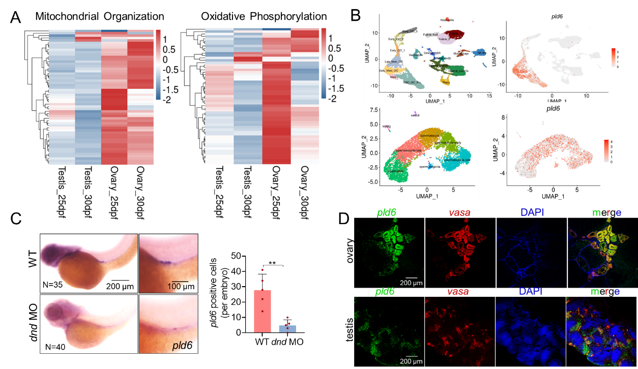 研究者首先对性腺分化阶段的精卵巢进行转录组分析,发现线粒体组装以及氧化磷酸化相关基因在卵巢中的转录水平显著高于精巢,提示GSPCs向卵子的分化需要更强的线粒体供能。进一步通过对精卵巢的单细胞转录组分析发现,调控线粒体融合的关键因子pld6不仅在卵巢组织高表达,而且特异表达于包括GSPCs在内的生殖细胞中(图1)。