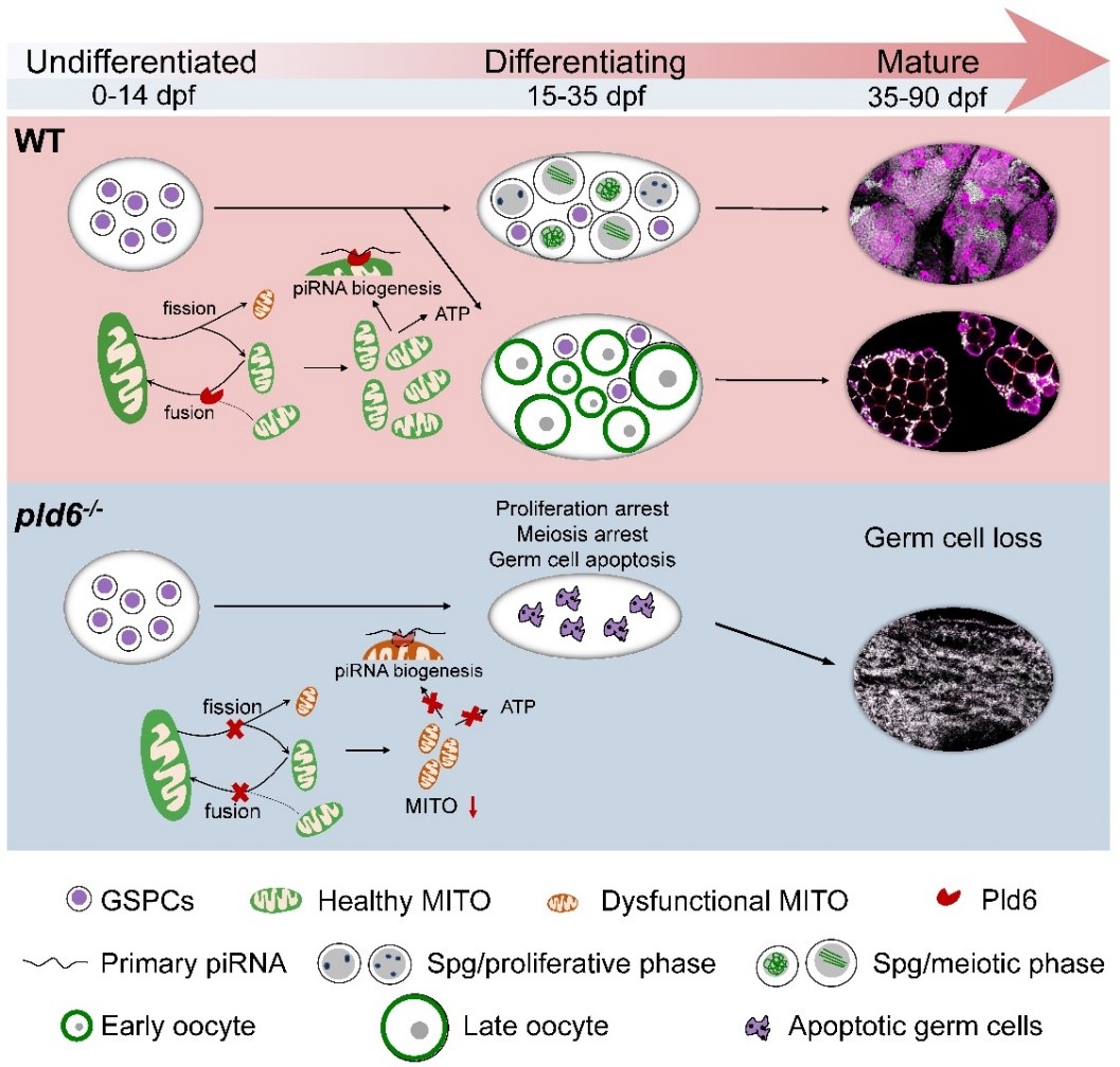 随后,研究者建立pld6缺失的斑马鱼突变体模型,结果纯合突变体全部发育为不可育的雄性,组织学和细胞生物学研究显示纯合突变体性腺中的生殖细胞完全丢失。对突变性腺的发育进行时序追踪和研究,发现pld6缺失的GSPCs既无法通过有丝分裂进行增殖,也无法通过减数分裂进行分化,从而在性腺发育早期即走向细胞凋亡途径。进一步研究揭示,突变体GSPCs中线粒体动态失衡,线粒体拷贝数以及ATP合成均显著减少,同时生殖细胞中特有的线粒体云(mitochondria-nuage)在突变体GSPCs中缺失,进而导致piRNA的合成受阻(图2)。因此,该研究发现一个新的特异存在于生殖细胞中的线粒体融合调控因子,并揭示了其调控了鱼类GSPCs命运维持与分化的分子和细胞学机制。