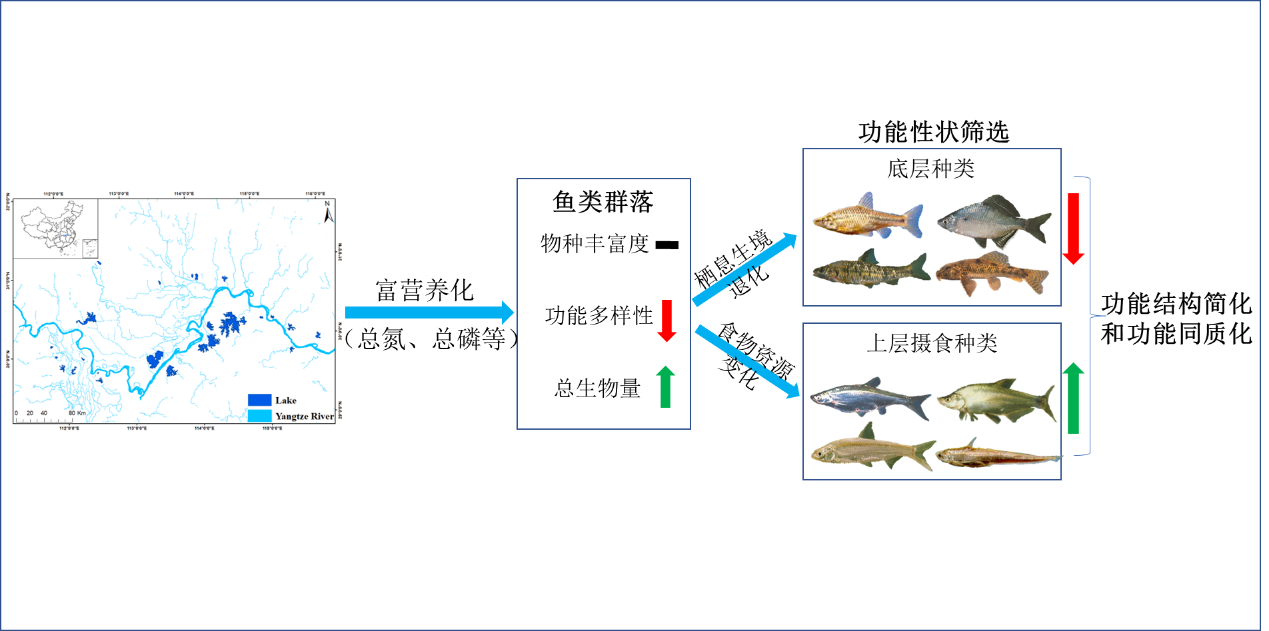 在全球气候变化背景下,鱼类资源过度利用与水生态系统退化等多重环境压力正日益严重威胁着渔业水域食物可持续产出与水生态系统健康。其中,人类活动造成的营养物质快速积累在水生生态系统中引起了广泛的生态问题,由此产生的富营养化极大改变了全球鱼类群落。鱼类群落由具有不同功能性状的物种组成,而物种的功能性状决定了一个物种在特定生物与非生物环境条件下的生长、存活、摄食、繁殖、行为等特征,反映了物种与非生物环境因子及生物间相互作用的关系,直接影响生态系统的结构与功能。然而,鲜有研究探讨富营养化作为重要的环境过滤器如何作用于鱼类功能性状和功能结构。