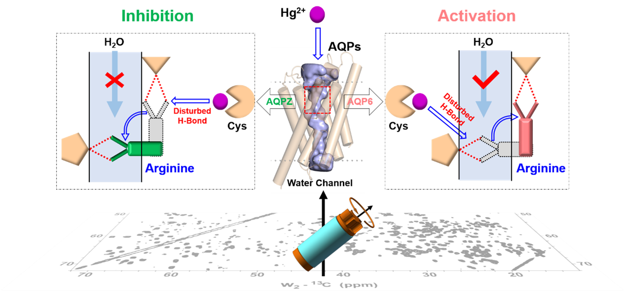 近日,精密测量院刘买利、杨俊研究团队与中科院上海药物所研究员于坤千、新加坡国立大学教授林青松、江苏师范大学教授开雷等研究团队合作,利用固体核磁共振和分子动力学模拟等研究方法揭示了汞离子调控水通道蛋白(AQP)功能的分子机制,为开发AQP功能调节剂提供了理论指导。相关研究成果发表在化学类综合性期刊《美国化学会志》(J Am Chem Soc)上。