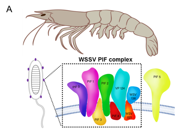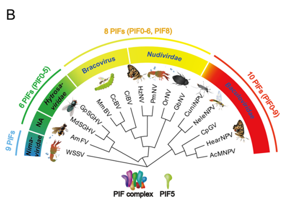 图示: A. WSSV中PIF复合物和PIF5的模型; B. PIF复合物和PIF5在多种感染节肢动物的大DNA病毒中保守存在