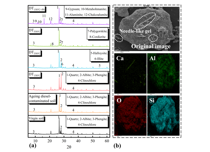 中国科学院武汉岩土力学研究所海洋与环境岩土工程研究中心科研人员利用结构表征、形貌表征和化学形态表征相结合的方法,对典型热修复后土壤的微观性质的变化进行了定性、定量分析,采用X射线光电子能谱和扫描电子显微镜等微观观测手段(如图1),发现了热效应对土壤结构转化机制的影响规律,确定了土壤演化生成新矿物、分解矿物和有机质(铁锰离子释放)及热解炭几个关键影响行为(如图2)。有机质的分解和热解炭的赋存使土壤pH值发生波动,并降低表面电位;并进一步发现了热修复后土颗粒的再胶结和新矿物(如伊利石、堇青石)的形成使其具有更高的抗压抗剪强度,渗透系数因水化层的压缩及新矿物的生成而增大。