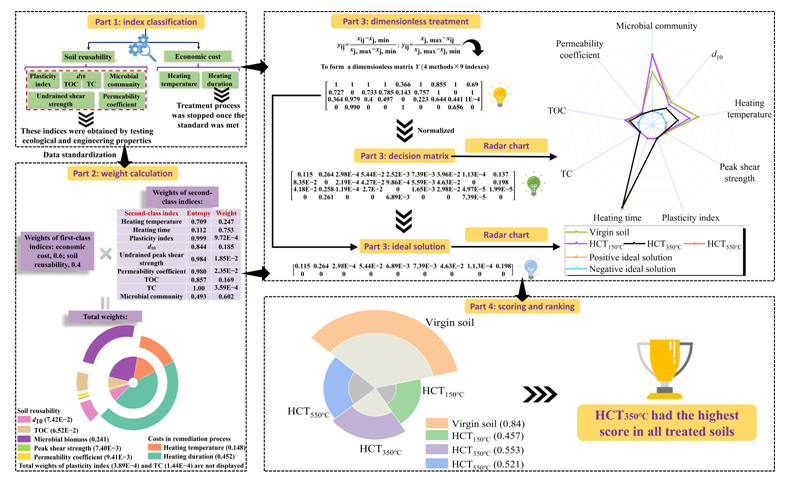 团队以四种典型异位热脱附技术为背景(150°C/350°C/550°C热修复及150°C热氧化耦合修复),建立考虑修复成本和修复后土壤再利用的综合指标,包括力学参数(如液塑限、粒径分布、渗透系数等)和生态指标参数(如土壤碳量、生物量等)。开发了一种基于AHP-EWM-TOPSIS模型的可持续性评估工具,构建了实际修复成本-土壤工程利用价值-土壤生态利用价值的综合评价体系(如图3),实现了从其备选修复技术包中优化遴选的技术突破,为污染土的绿色低碳处置及修复提供了关键技术支撑。