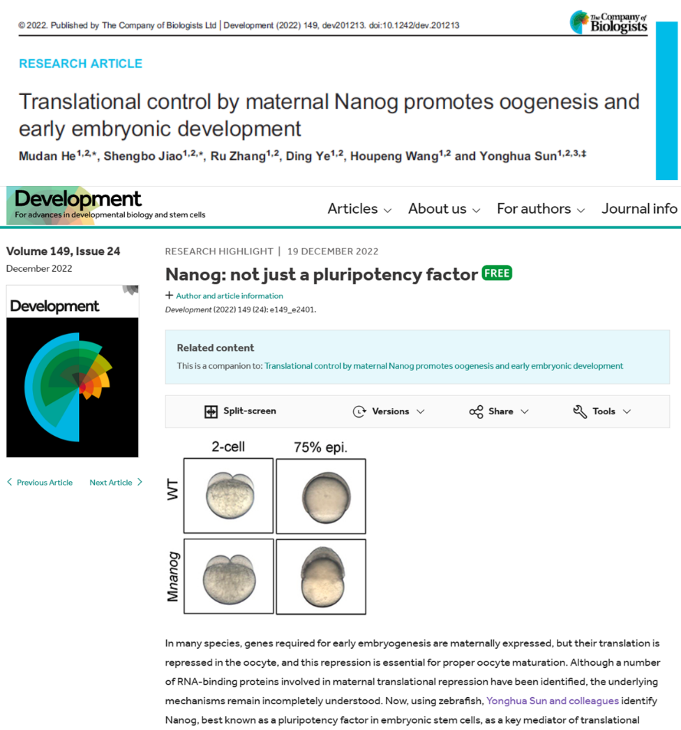 12月19日,水生所孙永华研究员团队在国际学术期刊Development上发表了题为“母源Nanog通过翻译控制促进卵子发生和胚胎发育”的研究论文(Research Article),以斑马鱼为模型揭示了母源因子Nanog通过在全局水平调控母源mRNA的翻译控制从而促进卵子质量的新机制。该文被主编遴选为该期的研究亮点(Research Highlight),并配发题为“Nanog,不仅是一个多能性因子”的点评文章加以重点推荐。