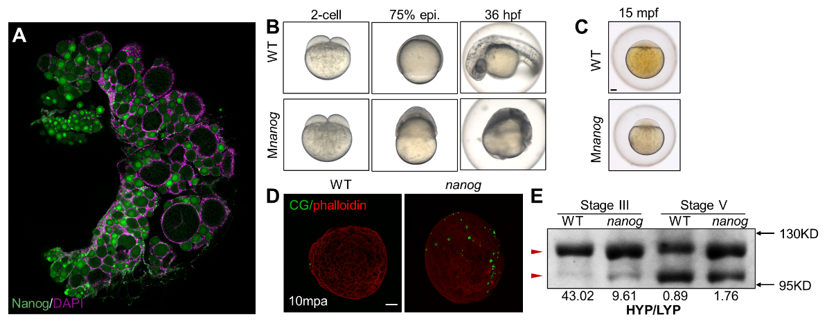 在前期研究中,该团队利用斑马鱼模型,通过TALENs技术构建了重要母源因子Nanog的功能缺失突变体(He et al., Mutation Research, 2015),阐明了母源Nanog与TCF因子结合抑制母源β-catenin信号的全局性激活从而保护早期胚胎发育的新机制(He, et al, 2020, PLOS Biology)。然而,作为在卵子发生过程中即开始表达的重要母源基因(图2A),Nanog在卵子发生过程中的调控作用依然未知。通过对nanog母源突变体的表型进行分析,该团队发现缺失母源nanog导致早期胚胎严重败育,突变体的卵子成熟出现严重缺陷(图2)。