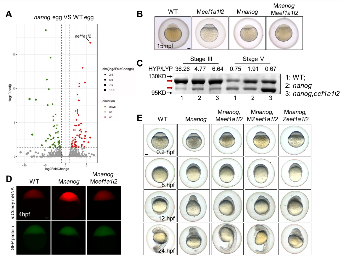 图3 共敲除eef1a1l2可以拯救nanog突变体的卵子发生和早期胚胎发育缺陷
