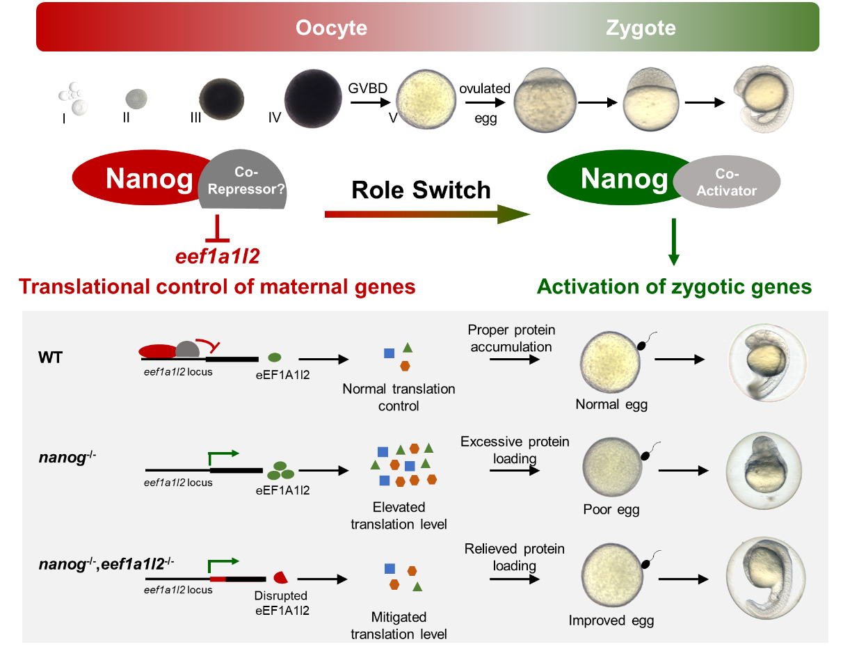 通过以上研究,该团队发现了母源因子Nanog通过对母源mRNA的翻译控制调控卵子发生和早期胚胎发育的新机制(图4):在野生型卵子中,Nanog通过结合在翻译延伸因子eef1a1l2的启动子抑制其转录,以确保卵子中的翻译活性处于正常水平,产生的卵子可正常受精并指导早期胚胎发育;在nanog突变体中,由于缺失了Nanog对eef1a1l2的转录抑制作用,eef1a1l2在卵子中异常激活转录,导致卵子发生的翻译机器异常激活,过量蛋白积累导致卵质变差,最终导致受精后的胚胎出现发育缺陷;当共敲除eef1a1l2之后,双突变卵子中的翻译机器恢复到正常水平,蛋白质表达过载得到缓解,卵质显著提升,早期胚胎发育的缺陷也得到显著的拯救。因此,该研究揭示了Nanog在卵子发生过程中作为转录抑制子抑制翻译延伸因子eef1a1l2的转录,从而在全局水平上对卵子发生过程进行翻译控制,促进卵子发生和早期胚胎的发育。