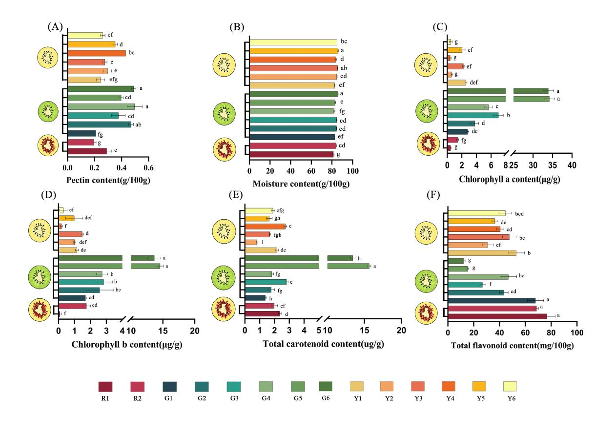 图1 不同猕猴桃品种果胶、水份、叶绿素、类胡萝卜素和总黄酮含量
