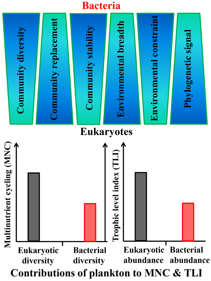 本研究揭示了浮游真核生物而非细菌的丰度及多样性与湖泊水体营养状态联系更紧密。浮游真核生物体现出更强的物种替换、更广泛的环境位宽和更强的系统发育信号;浮游细菌则体现出更强的群落稳定性和环境限制。较强的多样性与多元素循环之间的关系保证了较强的多样性与水体营养状态之间的联系。