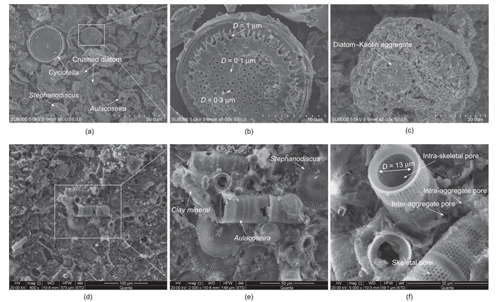 中国科学院武汉岩土力学研究所特殊土土力学组徐倚晴硕士与张先伟副研究员等,通过环境扫描电镜、原子力显微镜等微观测试技术调查了含硅藻化石沉积物的纳米至微米级别的结构特征,发现硅藻骨架的中空孔隙是造成硅藻土高孔隙比与高液限值的主要原因;借助高压等应变速率压缩试验,研究含硅藻化石沉积物的压缩、回弹与水力特性,发现了大体积的内骨架孔隙与硅质骨架是引起硅藻土具有高压缩性与低回弹性的主要原因,同时高压下的硅藻渐进性破碎会进一步提高土的压缩潜势;最后,耦合宏微观分析,提出一个能够反映硅藻破碎与孔隙结构演化的含硅藻沉积物的压缩概念模型。本研究对于深入了解生物质沉积物的力学行为机理,对含硅藻软弱夹层的海底滑坡稳定性分析有一定的帮助。