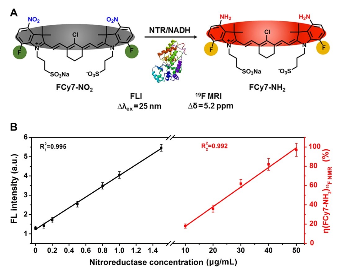 本工作提出的利用19F磁共振/荧光双模态成像技术用于肿瘤中硝基还原酶的精准成像及定量分析方法可为肿瘤标记物的精确诊断提供一种重要工具。同时,根据硝基还原酶的含量可用于区分正常和缺氧肿瘤组织,定量评估缺氧程度,有望为生物医学领域提供新方法和新技术。