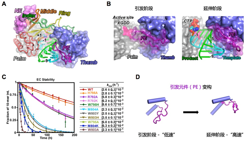 图:从头合成型病毒RdRP引发-延伸转换机制。A)登革病毒NS5 RdRP延伸复合物晶体结构。B)引发元件变构(从左至右)后与双链RNA建立新的相互作用。C)引发元件可提升延伸复合物稳定性。D)引发元件变构简图(与动图类比)。