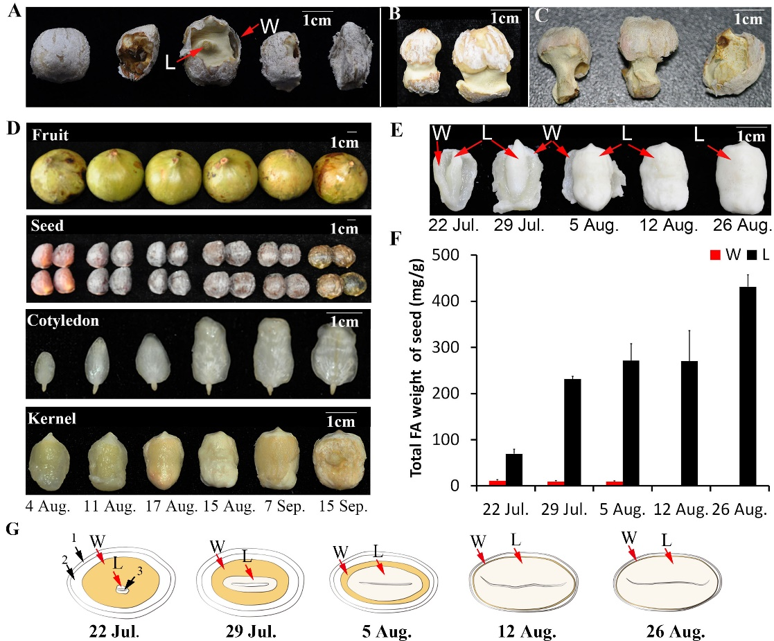 油桐树是世界著名的工业油料树种。胚乳是油桐种子中油脂的主要储存器官。前期对油桐种质资源种子性状的观测,发现填充异常而导致油桐种仁形状异常(图A-C)。基于此现象仔细观察油桐种仁的发育过程,发现在油桐种仁中,子叶外围的组织可进一步分成内外两层。内层在油桐种子油脂积累前期体积非常小,而外层体积较大(图E)。随着油脂积累的启动,内层体积快速膨大,最终发育为成熟的胚乳组织,大量积累油脂;而外层体积逐步变小,变成一层干的薄膜紧紧覆盖在胚乳组织外围,不积累油脂(图F)。