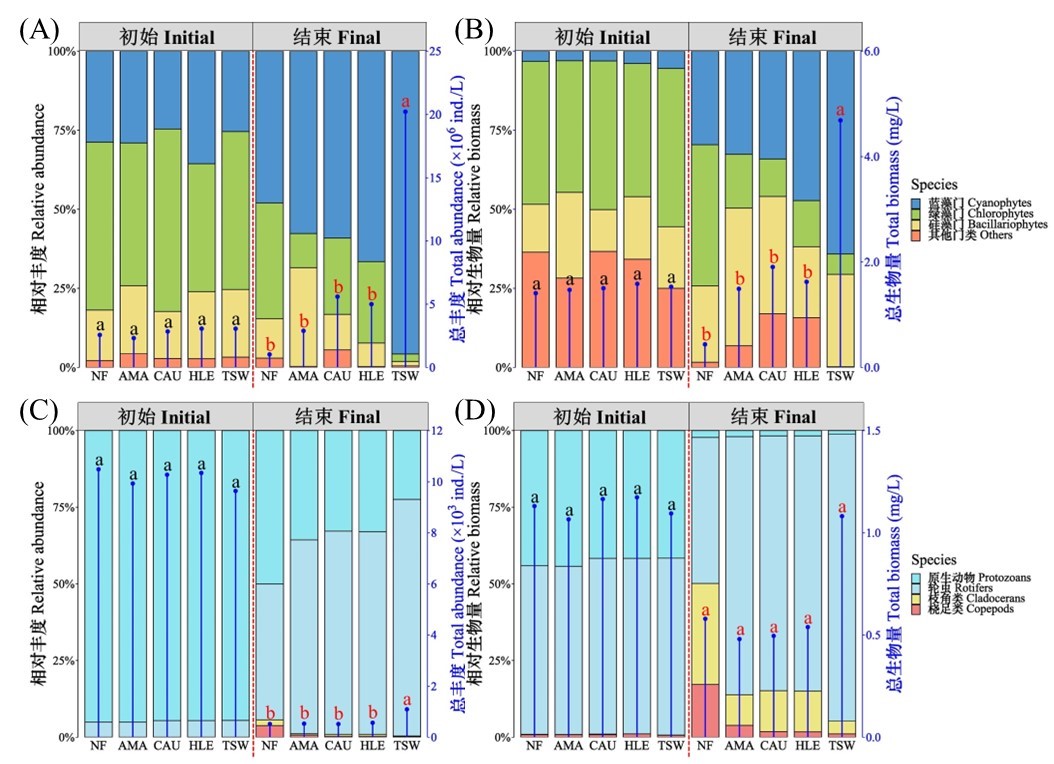 图3 实验初始和结束各处理组浮游植物相对丰度和总丰度(A)、浮游植物相对生物量和总生物量(B)、浮游动物相对丰度和总丰度(C)、浮游动物相对生物量和总生物量(D)