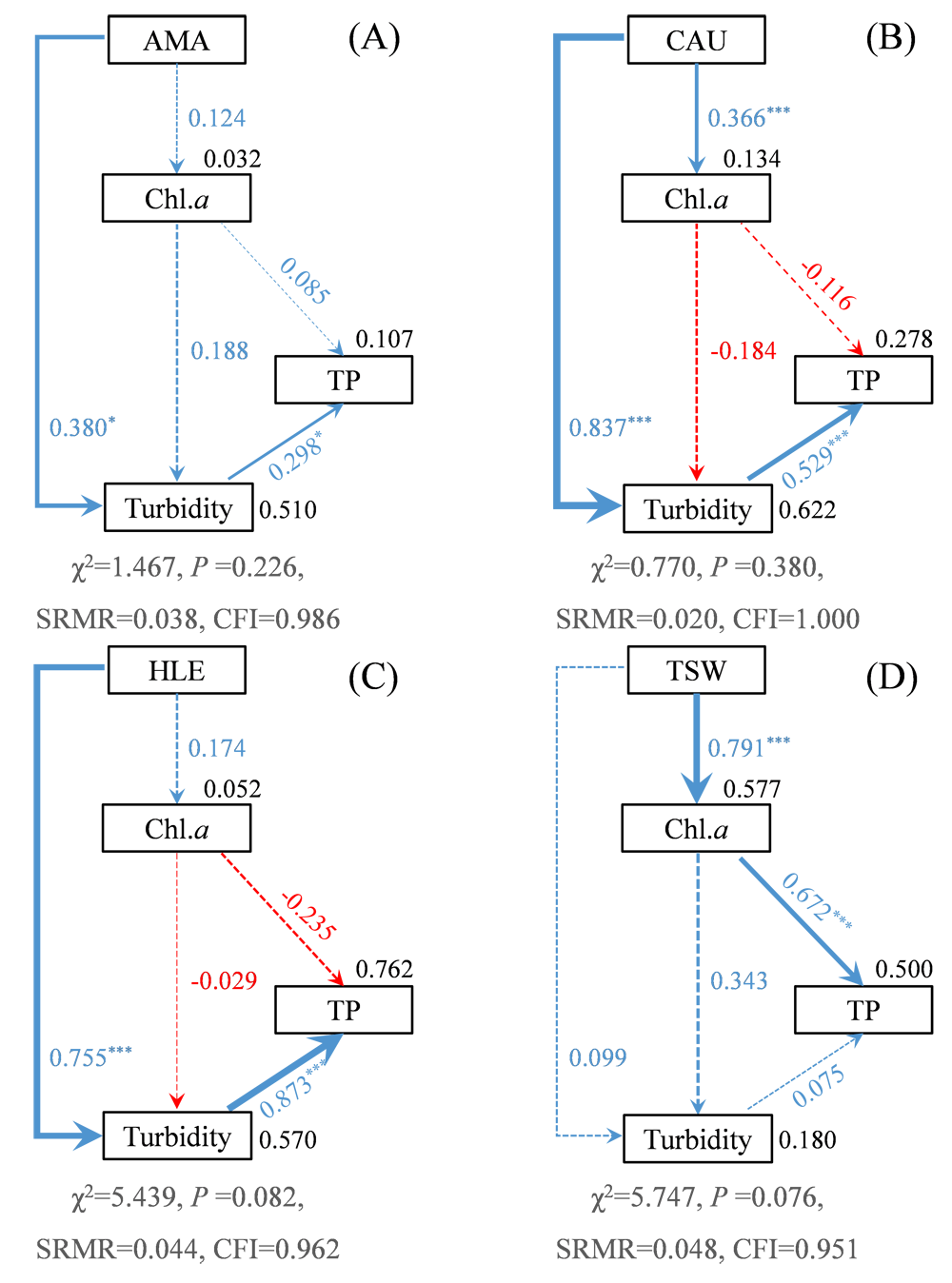 图4 不同处理组中小型鱼类、叶绿素a、浊度和总磷的结构方程模型(箭头的方向代表从独立变量到因变量,箭头上的数字对应标准化的路径系数,标准化路径系数表示关系的相对强度。显著路径系数和非显著路径系数分别用实线和虚线表示;蓝色和红色箭头分别表示因果关系的正流和负流。星号表示显著性:P < 0.001 (***),0.01 < P < 0.05(*))