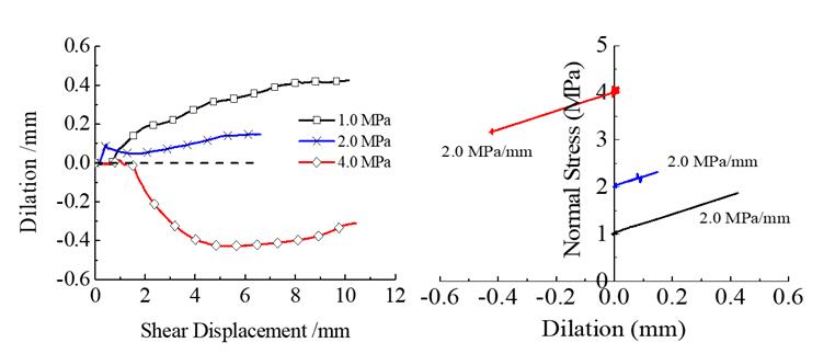 图5 砂屑灰岩-混凝土恒定法向刚度剪切剪胀演变规律