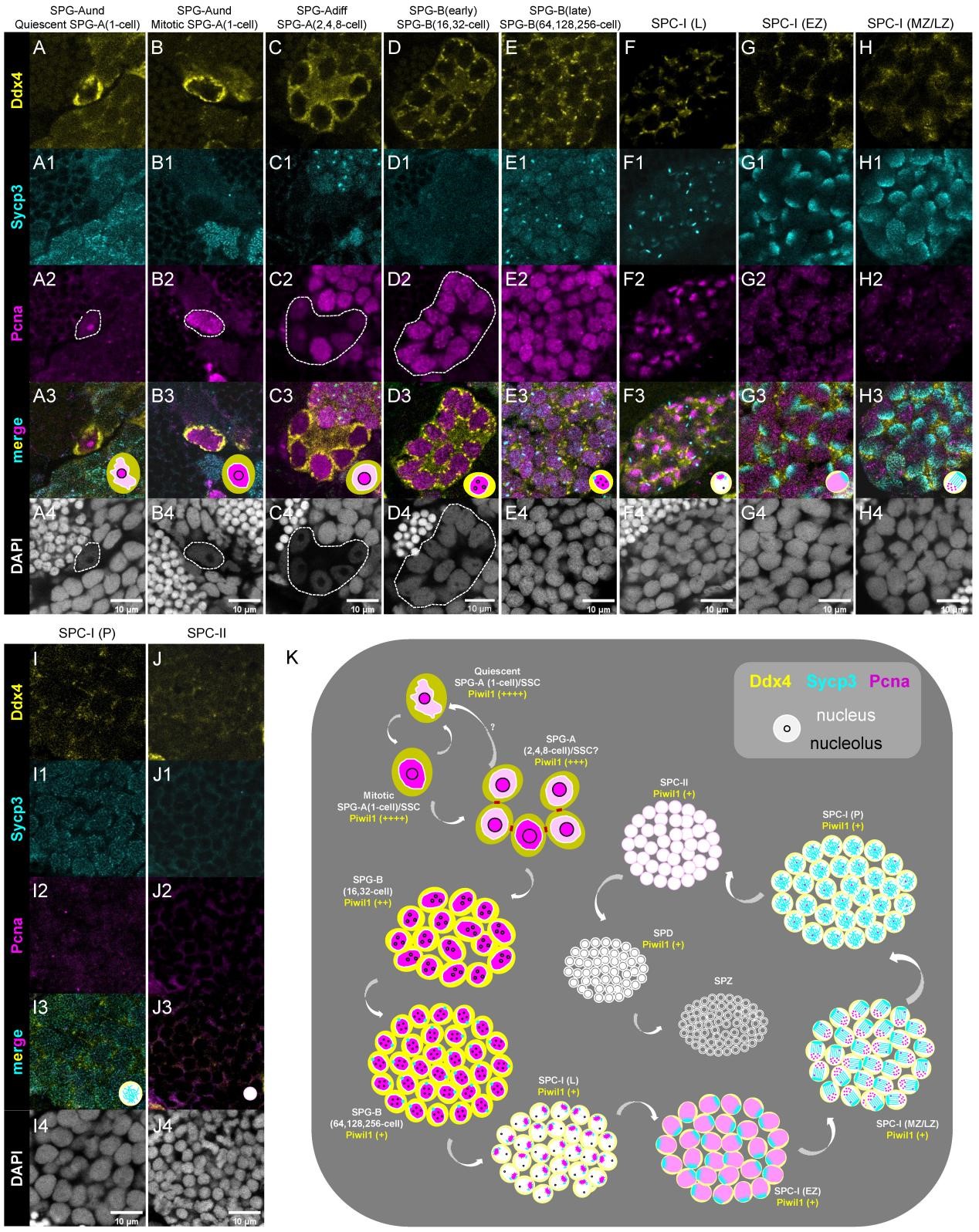 图2 利用Ddx4、Pcna、Sycp3及细胞核的四色免疫荧光技术对不同亚型生精细胞进行精确鉴定(A-J)),提出鱼类生精细胞亚型鉴定的新标准