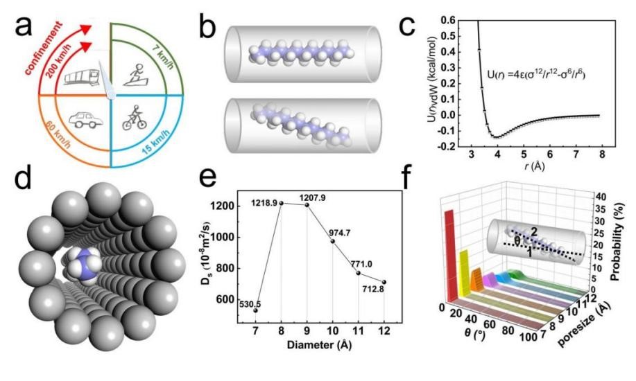 团队基于多尺度理论模拟,发现在一定孔径范围内,分子筛限域孔道中存在孔径越大长链烷烃扩散越慢的反常扩散现象。受到超级高铁运行原理的启发,建立了一系列亚纳米直孔道模型,确定了长链烷烃实现快速扩散的条件—客体分子“悬浮”在孔道正中心运行并保持线性构型(图1)。根据该模型筛选出一系列真实存在的孔径适中的分子筛(TON、MTW、AFI和VFI),验证了该理论模型的正确性。进一步基于主客体相互作用、弯曲角度、扩散轨迹和扩散自由能分析(图2),揭示了调控长链分子自由度达到分子“悬浮”的条件从而实现超快扩散的微观机理。进一步与中科院大连化物所叶茂研究团队合作,基于吸附速率法扩散实验验证了分子筛中长链烷烃的超快扩散行为。在TON、MTW和AFI分子筛中短链(C4)和长链烷烃(C12)的扩散趋势与孔径呈现出完全相反的状态:短链烷烃的扩散系数随着孔径的增大而增加,而长链烷烃的扩散系数随着孔径的增大而减小。利用红外实验验证了不同孔径中长链分子的形变差异(小孔径中分子形变较小,大孔径与之相反),这些结果与分子动力学模拟的结论一致,从而揭示了线性长链烷烃在限域孔道中的超快扩散机制。