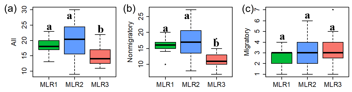 图2 箱型图显示了MLR1(绿色)、MLR2(蓝色)和MLR3(红色)江段(a)所有物种、(b)非洄游性物种和(c)洄游性物种α多样性的平均值±标准差