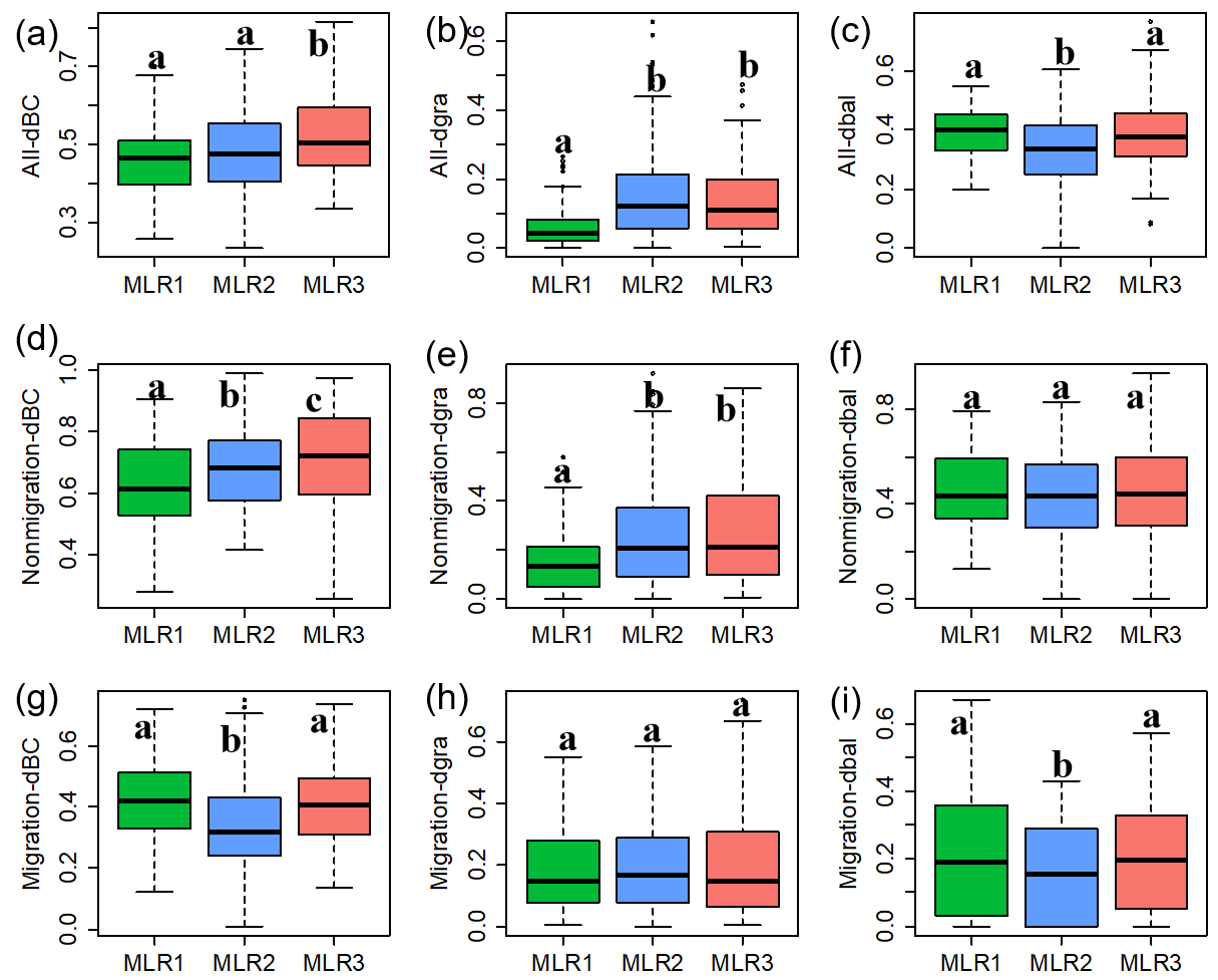 图3 箱型图显示了MLR1(绿色)、MLR2(蓝色)和MLR3(红色)段(a,b,c)所有物种、(d,e,f)非洄游性物种和(g,h,i)洄游性物种β多样性(dBC(总β多样性)、dgra(嵌套组份)和dbal(轮转组份))的平均值±标准差
