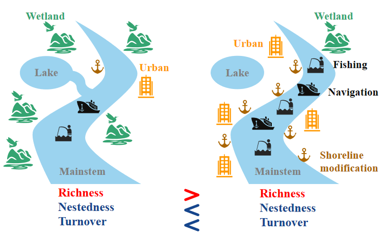 流域景观格局和人类活动干扰影响淡水生物多样性的格局。然而,目前鲜有研究关注江湖连通、岸带湿地和人类活动等因素对大型河流鱼类α和β多样性格局的驱动。