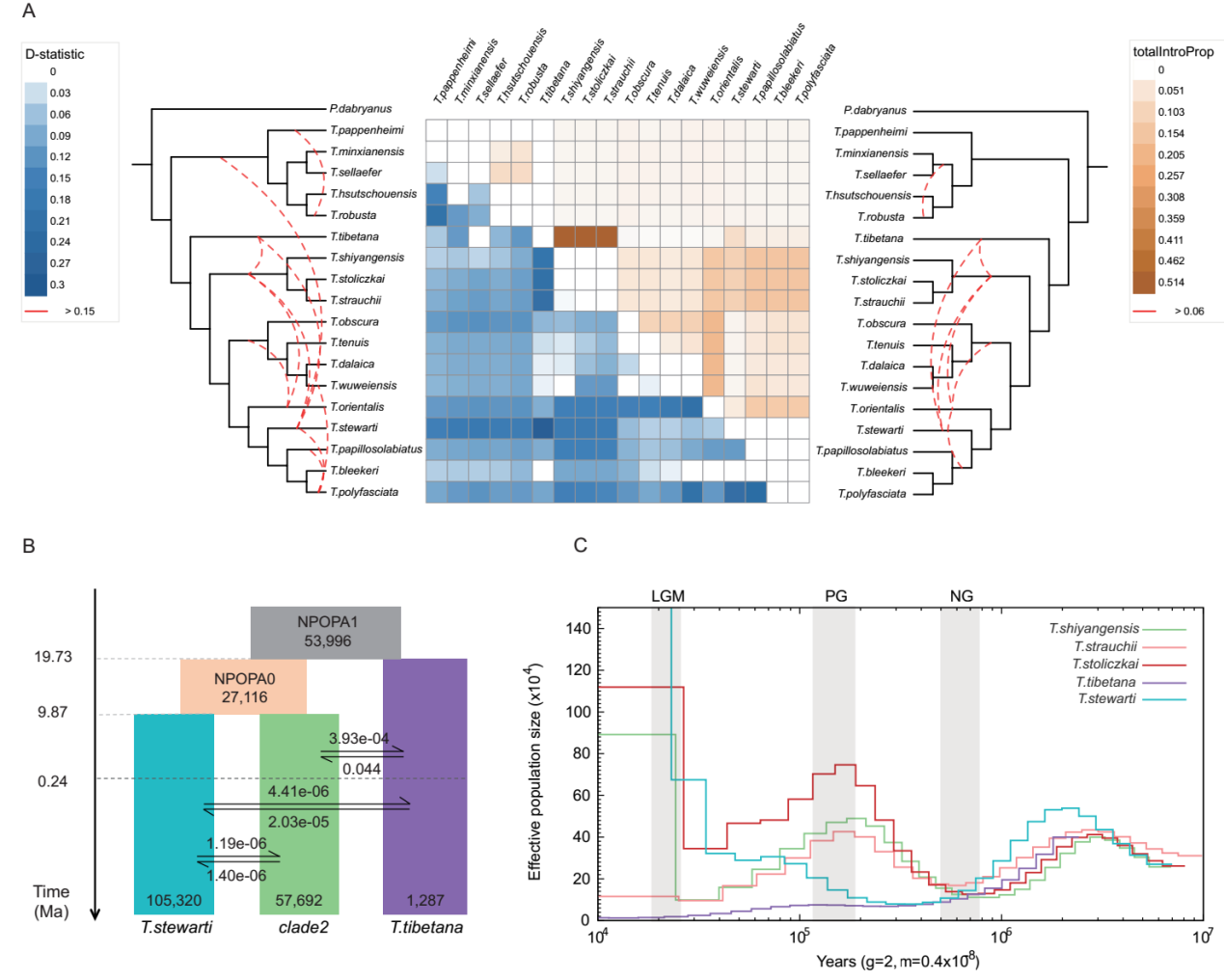 对西藏高原鳅(T. tibetana)及其它4个显示强烈基因渗入信号的高原鳅属鱼类进行种群动态历史和物种形成溯祖模拟分析,结果显示,伴随着青藏高原隆升和气候周期性变化,高原鳅属鱼类物种的有效种群大小(Ne)也呈现出周期性的上升和下降。西藏高原鳅在Penultimate glaciation(PG)冰期后所呈现出来的有效种群大小和核苷酸多样性(π)下降,结合生物地理学和地质学证据推测,可能与青藏高原第三次隆升过程中剧烈而不均匀的构造上升运动所造成的分布地隔离有关。研究还发现了大约在 0.24~9.87 百万年前在西藏高原鳅和高原鳅属鱼类祖先进化枝之间发生的古代基因流事件的证据。