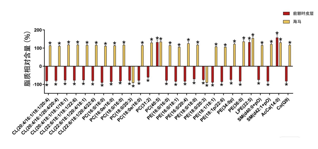 图2. 300 μg/kg bm/day染毒180天后小鼠海马和前额叶皮层的相同脂质分子表现出相反的含量变化趋势