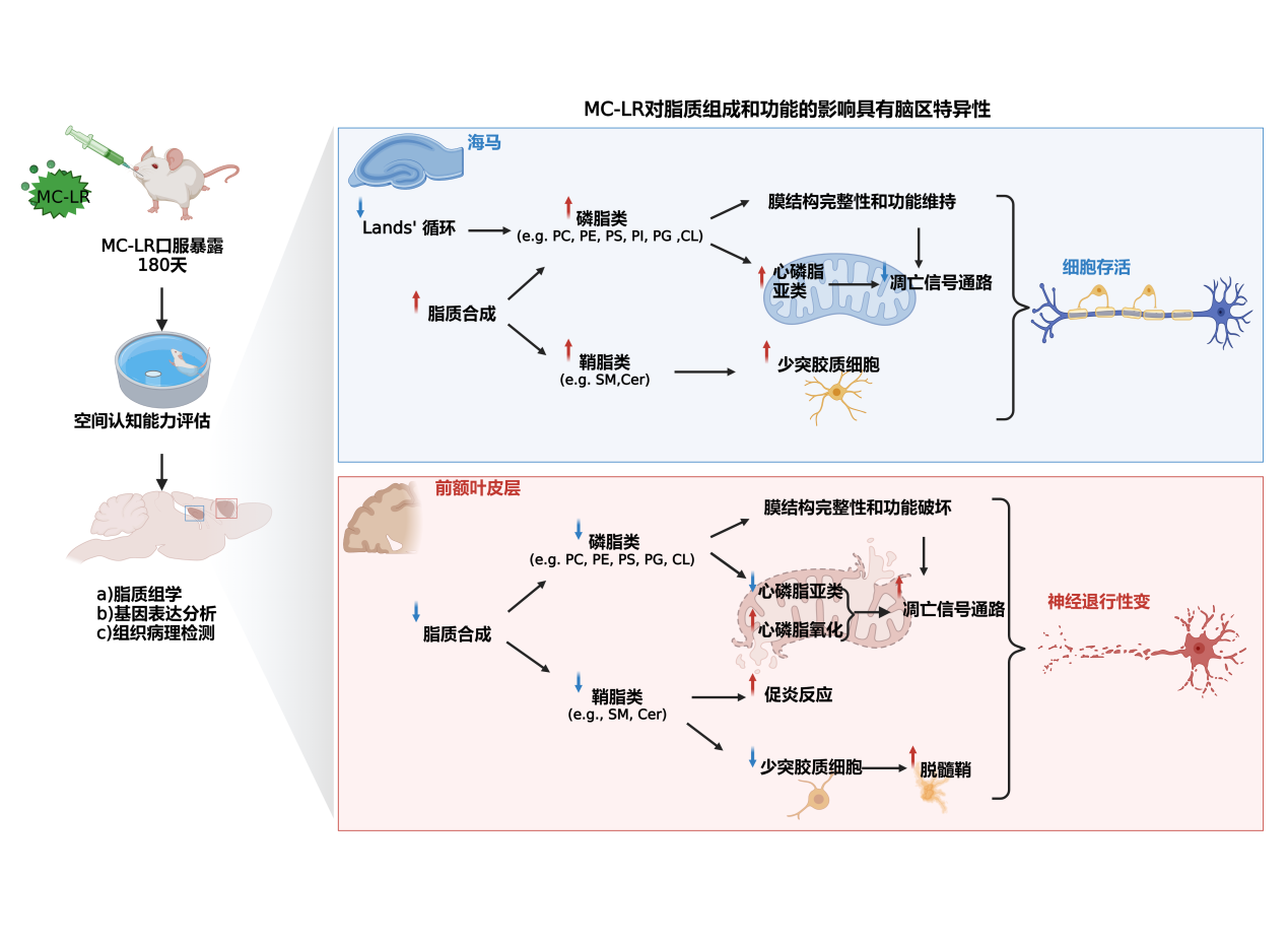 随着水体富营养化日益严重以及气候变暖,全球湖泊蓝藻水华日益频发。蓝藻衍生污染物微囊藻毒素(Microcystins, MCs)慢性暴露已成为全球性健康问题。MCs具有强烈的神经毒性,能够影响哺乳动物大脑结构和功能,并与人群神经退行性疾病阿尔兹海默症有关。但既有研究或基于整个大脑(不分区)或主要关注在认知中起重要作用的海马区, MCs对其他脑区的神经毒性作用以及潜在分子机制知之甚少。同时,脂质作为脑组织的主要组成成分,在大脑结构和功能中起着重要作用,但是MCs对哺乳动物大脑脂质侧面的影响鲜有相关研究,这阻碍了对 MCs 的神经毒性作用及其机制的深入理解。