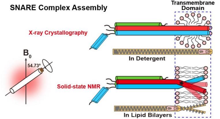 该研究基于固体NMR和膜融合实验的研究结果,提出了SNARE复合体在磷脂膜环境中的组装机制:SNARE复合体从N端组装到靠近磷脂分子层的C端,加速囊泡与质膜的靠近,并将机械力和能量传递到外膜界面。而后,松散组装且高度动态的跨膜区域会扰动其周边磷脂的排布,从而诱发囊泡与质膜的内膜发生接触并促进内膜融合。该研究显示SNARE复合体在磷脂膜环境中和去垢剂环境中存在不同的结构状态,证明了磷脂膜环境对SNARE复合体结构和功能的重要调控作用。