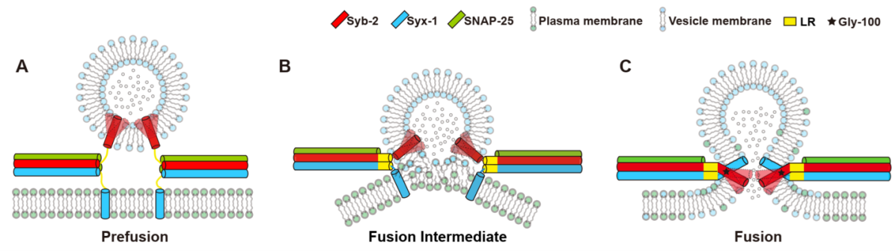 膜融合过程在生物体内的多种生理活动中普遍存在,大多数有效并可控的膜融合过程是由SNARE蛋白之间的协同作用所介导的。在神经元中,三个SNARE蛋白Synaptobrevin-2 (Syb-2),Syntaxin-1 (Syx-1)和SNAP-25组装成SNARE复合体,驱动突触囊泡和质膜融合以释放神经递质。尽管前人在SNARE复合体结构和功能的研究方面均取得了重大进展,但是SNARE复合体在膜融合过程中的组装机制仍然存在诸多争议。其中争议较大的是SNARE所介导的膜融合过程是否需要SNARE复合体从N端一直组装到跨膜区域的C末端。