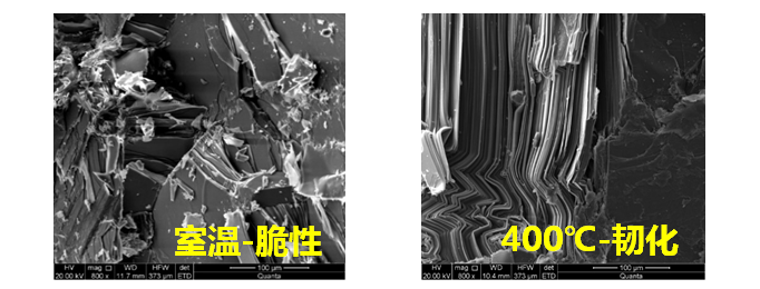 其次,基于该试验系统进行了实时高温(最高400℃)真三轴压缩试验,研究了不同温度下花岗岩力学特性随中间主应力的变化特征,并揭示了温度对中间主应力效应的影响。发现了云母矿物颗粒在高温下的韧化是造成花岗岩力学性能随温度增强的重要因素(图3),花岗岩宏观破坏特征随温度演化的总体趋势由剪切破坏为主转变为以拉伸-剪切破坏为主。