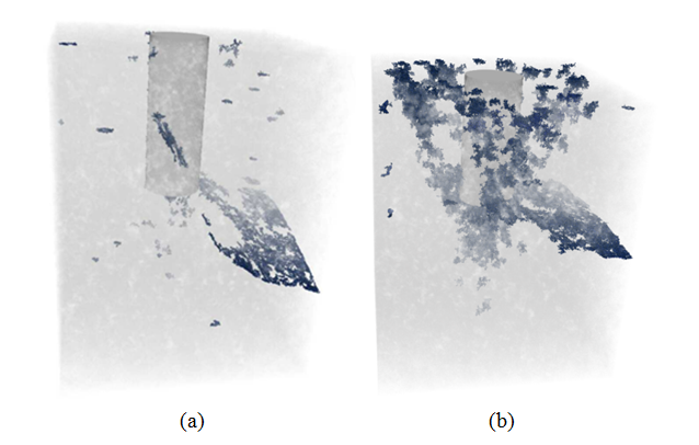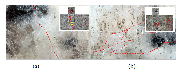 图5 压裂裂缝形态:(a)室温下单一主压裂裂缝;(b)200℃下的多尺度云裂缝