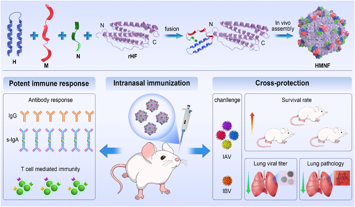 该研究开发了一种组装流感病毒多种抗原表位的广谱抗流感病毒候选纳米疫苗。该HMNF纳米疫苗经鼻腔黏膜免疫可诱导强效持久的抗体和细胞免疫应答,实现对多种甲型和乙型流感病毒亚型的交叉保护。同时,HMNF蛋白纳米颗粒能够利用大肠杆菌系统快速生产、具有经鼻喷自我接种的潜力,未来有望发展成为广谱抗流感病毒疫苗。这一研究成果已在《ACS Nano》期刊在线发表( https://doi.org/10.1021/acsnano.3c01829)。
