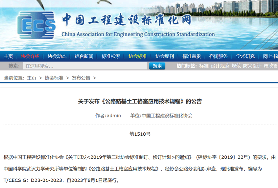 为规范土工格室在公路路基工程中的应用,满足工程安全可靠、经济合理、绿色环保的要求,中国科学院武汉岩土力学研究所路基工程学科方向组联合国内多家单位,在前期土工格室材料研发、室内试验、理论研究、现场应用示范的基础上,编制完成了《公路路基土工格室应用技术规程》,该规程编制历时四年,对土工格室在路基加筋、路基不均匀沉降防治、路基防护与支挡中的设计、施工和检测进行了详细规定,是我国土工格室路基工程应用领域的第一部规范,规程实施后可产生良好的经济效应和社会效益。