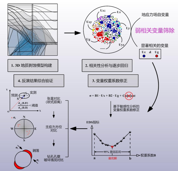 为此,在国家自然科学面上基金支持下,中国科学院武汉岩土力学研究所智能岩石力学组科研人员提出了一种考虑应力张量相关性的三维初始地应力场数值反演方法(图1)。该方法采用逐步回归剔除了与目标应力场相关性弱的自变量,以获得显著性更高的地应力场回归模型。同时采用提出的EDS指标基于欧几里得距离进行实测与预测应力张量的相似性比较,以进行变量系数修正及反演结果评价。