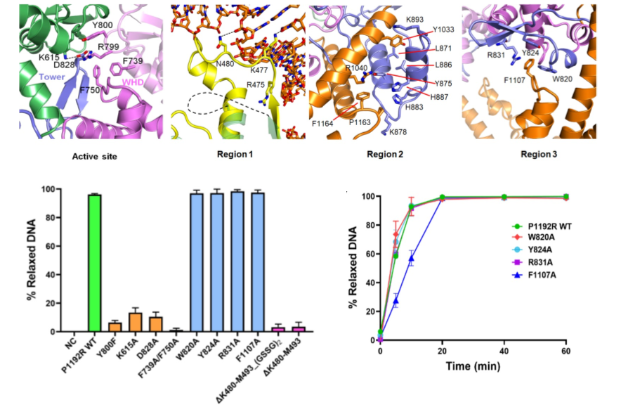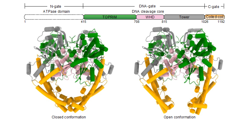 研究团队解析了两种不同功能状态下的P1192R冷冻电镜结构(图1)。尽管P1192R和已报道的其他真核和原核生物II型拓扑异构酶的氨基酸序列同源性较低,但是其整体的三维结构具有较高的相似性,即都形成同源二聚体,且每个单体主要由三个功能区域组成,分别是位于N末端的ATPase结构域、中间区的DNA切割核心区以及C末端的Coiled-coil结构域。值得注意的是解析的两种不同状态下的P1192R结构的主要差异来源于C末端的Coiled-coil结构域,其分别处于关闭和打开两种构象。这是首次在无DNA底物的情况下发现该区域呈现两种不同的状态,暗示Ⅱ型拓扑异构酶的Coiled-coil结构域可自发地打开或关闭。