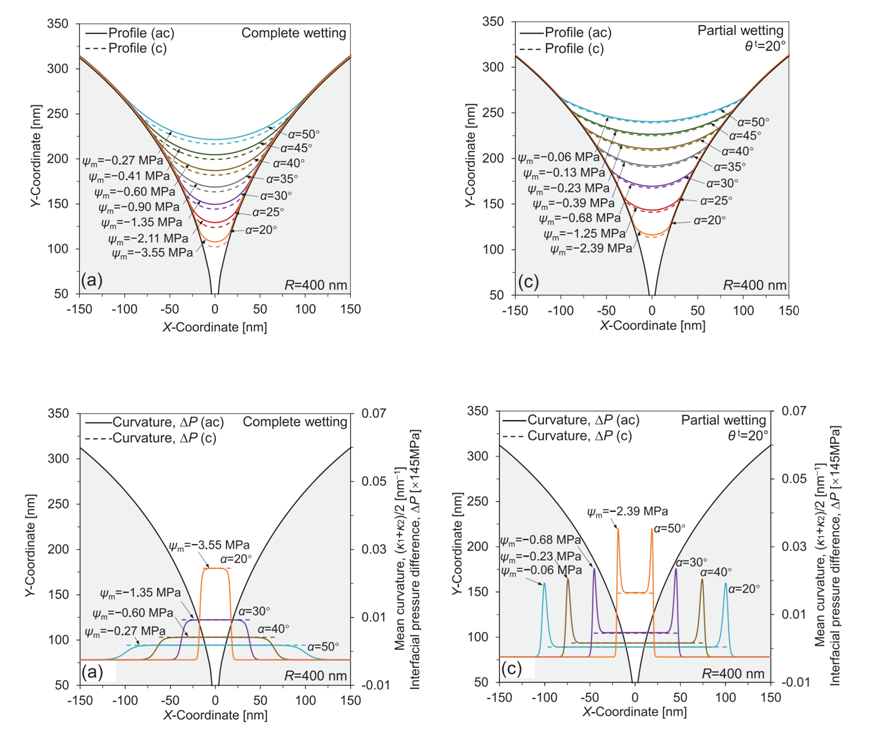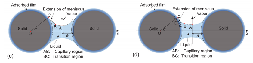 土壤或者其他岩土材料等多孔介质中的气液界面的几何特征和物理性质反映了多孔介质中水的赋存状态,并影响着多孔介质的水力和力学特性。对于亚微米级或者纳米级孔隙,多孔介质的固体基质对液体有着强烈的吸附作用并对气液界面的几何特征和物理特性产生不可忽略的影响。