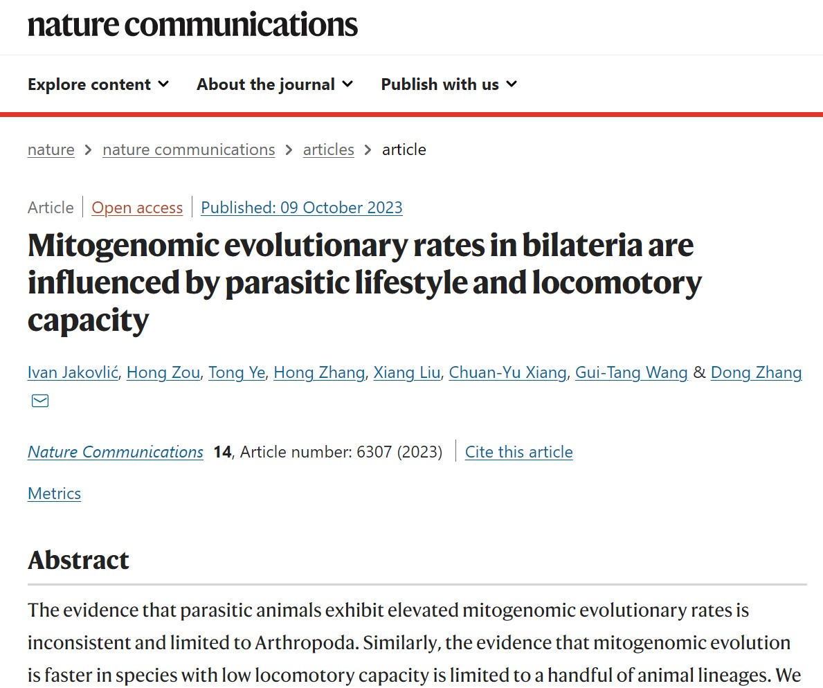 针对上述科学问题,10月9日,兰州大学/西藏大学张东课题组、中国科学院水生生物研究所(以下简称水生所)王桂堂学科组合作在国际知名学术期刊Nature Communications在线发表了题为“Mitogenomic evolutionary rates in Bilateria are influenced by parasitic lifestyle and locomotory capacity”的研究论文,揭示生活方式和运动能力是影响两侧对称动物线粒体基因组进化的主要因素。