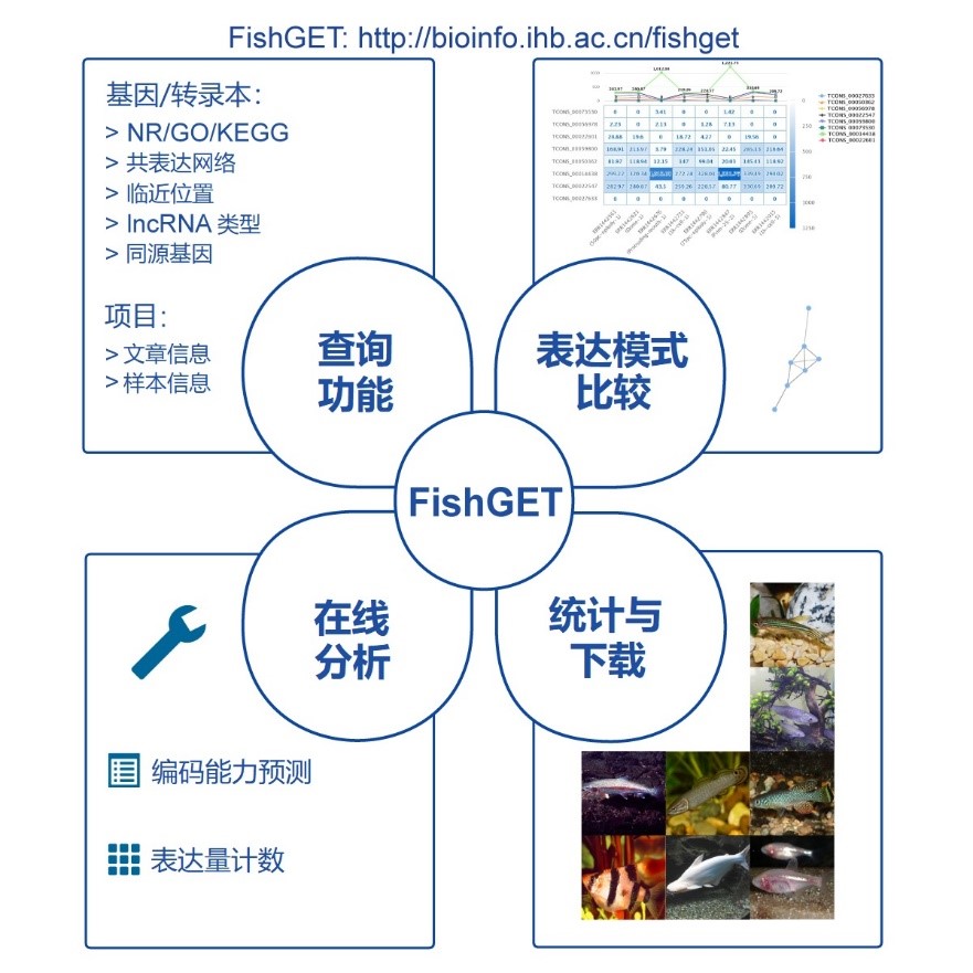 中国科学院水生生物研究所鱼类功能基因组学学科组收集整理了鱼类RNA-seq相关数据,建立了鱼类的常规转录组数据库FishGET(Fish Transcriptome and Expression Database. http://bioinfo.ihb.ac.cn/fishget)、单细胞转录组数据库FishSCT(Fish Single-Cell Transcriptome Database, http://bioinfo.ihb.ac.cn/fishsct)和空间转录组数据库FishSED(Fish Spatial Expression Database, http://bioinfo.ihb.ac.cn/fishsed)。
