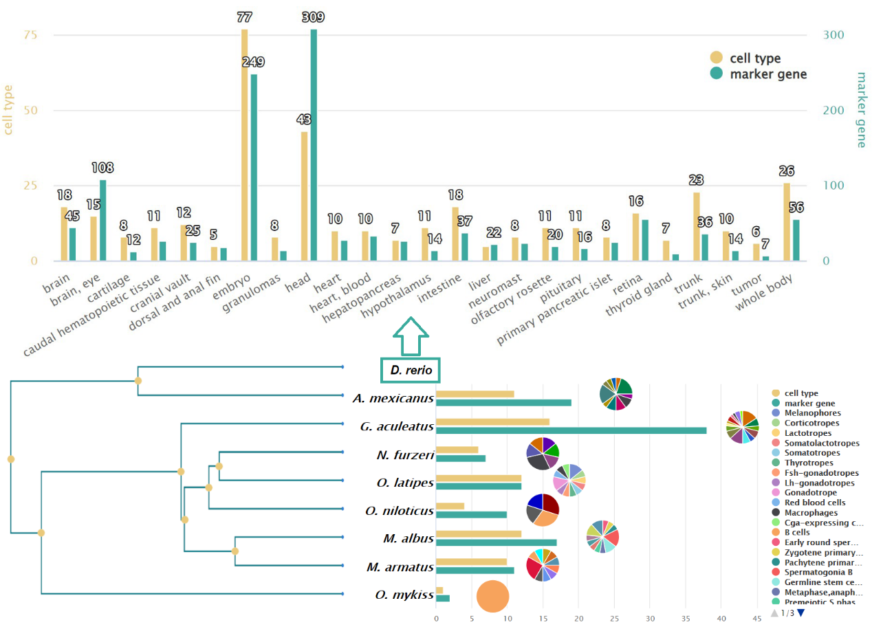 图2 FishSCT数据库中,斑马鱼及其它鱼类各组织/器官中细胞类型和标记基因的数量
