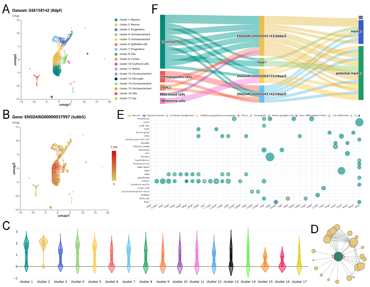 图3 FishSCT数据库的基因表达可视化示例和细胞类型识别功能。A-D,tubb5基因表达模式的可视化与蛋白互作网络展示;E-F,细胞类型识别功能