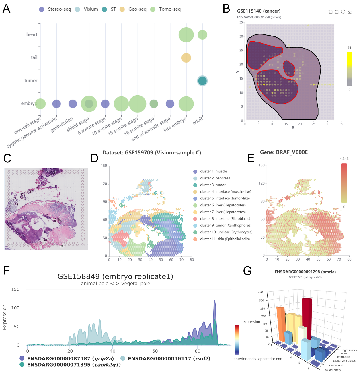 图4 FishSED数据库的内容和可视化结果示例。A,FishSED数据库的数据集分布统计;B-G,不同测序技术的可视化结果示例