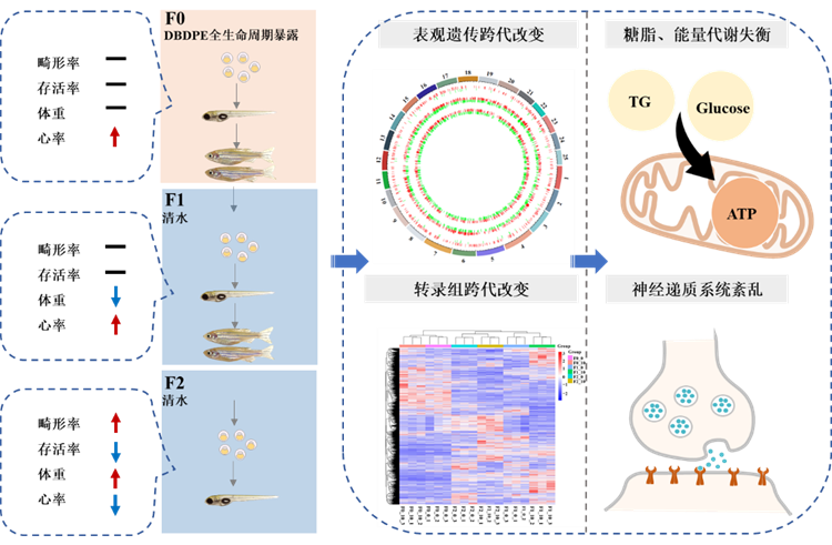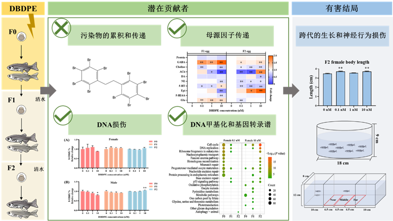 研究团队将F0代斑马鱼胚胎暴露于环境相关浓度的DBDPE至性成熟,繁殖产生F1代于清水中培养至性成熟,继续繁殖产生F2代。通过化学分析方法发现,DBDPE可以在F0代斑马鱼体内蓄积,但在未暴露的F1、F2后代中并未检测到DBDPE;成年阶段斑马鱼的生长和行为指标的变化,表明DBDPE全生命周期暴露造成对斑马鱼多代和跨代神经毒性;进一步研究发现,母源因子(如神经递质)传递异常、DNA损伤等对DBDPE引起的传代/跨代毒性具有重要贡献(图1)。