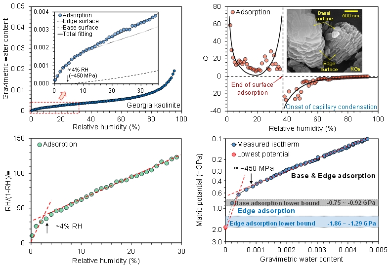 武汉岩土力学研究所董毅研究员长期致力于包括黏土矿物微观作用机理和非饱和土吸附在内的多相岩土介质力学与工程方面的研究。针对水在高岭土外表面吸附行为这一课题,运用分子动力学和元动力学方法,基于提出的热力学框架,研究了水吸附时基质势能、吸附结构和吸附顺序等性质。结果表明:高岭土侧面由于质子化和去质子化过程,相比基面具有更强的吸附特性(侧面最低基质势能可达 1.86 GPa,低于基面的(0.92 GPa),吸附水主要形成H-up和H-down两种结构,这种差异主要由矿物表面氢键作用导致;水分子会优先吸附在侧面,其次吸附在基面;结合实验测得的Georgia高岭土的吸附等温线,运用修正BET模型分析,对Georgia高岭土的吸附等温线做了侧面吸附和基面吸附的分解,验证了该吸附顺序。该成果为黏土矿物持水和力学特性的研究提供了吸附过程的微观机理解释。