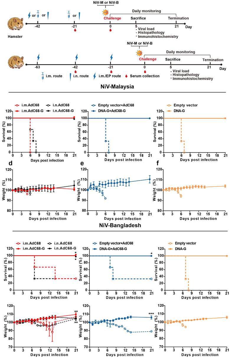 本研究以序列优化的NiV G为免疫原,开发了以缺陷型黑猩猩腺病毒为载体的重组疫苗(AdC68-G)和以质粒为载体的DNA疫苗(DNA-G)。在滴鼻、肌肉免疫AdC68-G、DNA-G初免/ AdC68-G加强免疫的BALB/c小鼠模型中,可检测到快速强效的T细胞免疫反应和长效的中和抗体,抗体可维持到免疫后68周,且无明显的下降趋势。在接下来的滴鼻、肌肉免疫AdC68-G、DNA-G初免 / AdC68-G加强免疫以及肌肉/电击免疫DNA-G的金黄地鼠攻毒模型中,也可检测到较高滴度的针对两种尼帕病毒株(NiV-Malaysia和NiV-Bangladesh)的中和抗体,并完全保护两种尼帕病毒株的致死性感染(图1),没有明显的体重减轻、临床症状或组织病理性损伤,大幅度降低或完全清除了金黄地鼠肺脏、脑和脾脏中的病毒。该疫苗未来有希望开发为尼帕病毒的候选疫苗,相关研究对尼帕病毒防控具有重要意义。