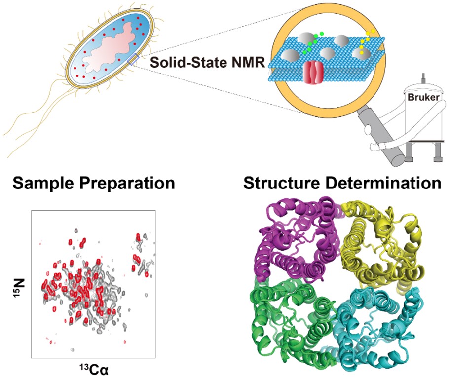 固体NMR在膜蛋白原位结构测定方面具有独特的优势,但同样也面临着背景信号干扰严重、目标信号信噪比弱、难以获得足够数量距离约束等严峻挑战。虽然前人已经进行了诸多尝试,但迄今为止,还未能成功在天然细胞膜中测定膜蛋白高分辨率三维结构。为了克服这些困难,杨俊研究团队提出了一种新的固体NMR结构测定方法,该方法包括改进的细胞膜样品制备方案、先进的固体NMR技术和结构模型辅助的归属策略,成功在天然细胞膜中实现了膜蛋白三维结构的测定。